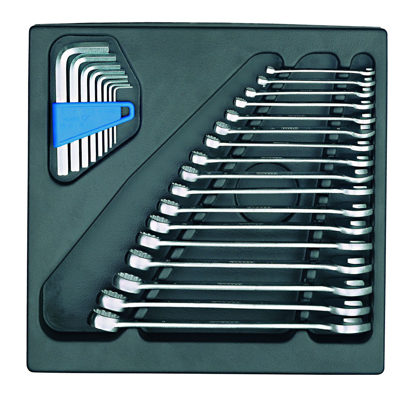 Suministrado en módulos de plástico 1500 ES, Hecho de plástico ABS resistente a los impactos, de grano negro, Resistente al aceite y a los ácidos, Cada herramienta queda fijada en su hueco, fácil de extraer gracias a los huecos para meter los dedos.